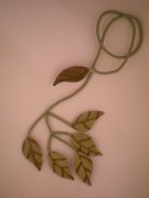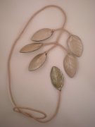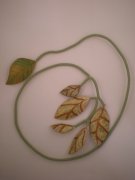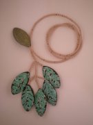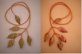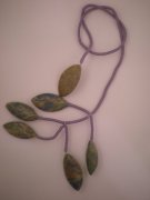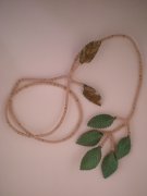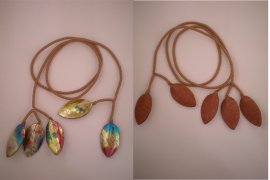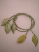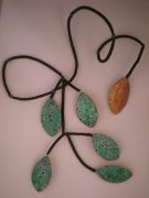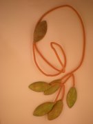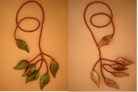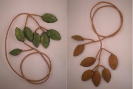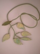 These necklaces are made with polymer leaves and recycled or scrap communications wire. The leaves are designed on branches and they have no closure, but are looped or tied around the wearer's neck. Both ends of the necklace have leaves, and they are reversible, as shown in the photographs below.