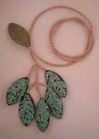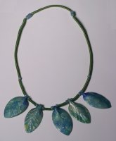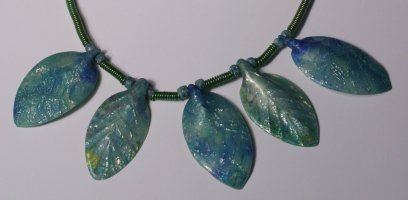 This particular necklace has leaves made from translucent polymer with metal leaf, using a technique derived from Japanese metal working called mokume gane (detail right). |