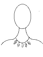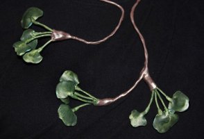 | These necklaces are made from polymer leaves and scrap communications wire. There are two closures at the back. By removing the center back piece, the necklace may be shortened. |